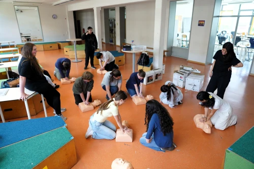 Zwölf junge Schüler:innen des 9. Jahrgangs treffen sich regelmäßig in den AG-Zeiten, um sich vorzubereiten für den Ernstfall. Ob Beulen, Kratzer oder Übelkeit: unsere Schulsanitäter:innen sind zur Stelle und helfen.