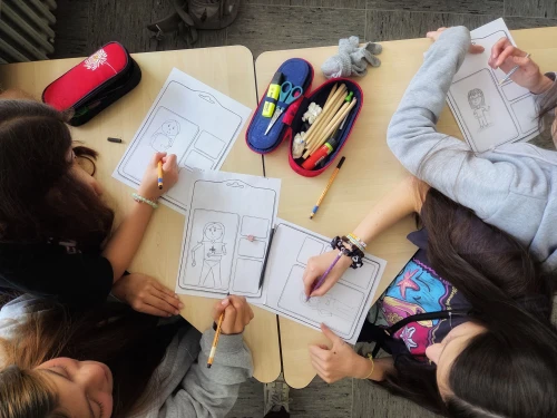 Bevor der Workshop startete, haben wir den Comic im Unterricht gelesen und darüber gesprochen, was es eigentlich heißt, introvertiert oder extrovertiert zu sein. Wir haben sogar einen Persönlichkeitstest durchgeführt – das war super spannend. Am 2. Juni durften wir dann endlich mit Carina Thomas selbst arbeiten. Sie hat uns erzählt, wie der Comic entstanden ist und wie man Gefühle und Persönlichkeit mit Bildern ausdrücken kann. Danach haben wir unsere eigenen Comic-Figuren gezeichnet. Manche waren still, manche bunt und kreativ – und alle waren irgendwie besonders. Es hat total Spaß gemacht, sich selbst oder eigene Gedanken in einer Figur darzustellen. Dabei konnten wir kreativ sein, skizzieren, ausprobieren – und auch über uns selbst nachdenken.