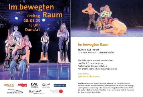 Diese Woche findet bereits zum siebten Mal seit 2013 unser „mixed-abled Tanztheater-Projekt“ statt. 15 Schüler:innen aus unserer Schule und der Albatros Schule erarbeiten gemeinsam mit den Choreografinnen der international arbeitenden DinA13 tanzcompany, Gerda König und Gitta Roser, eine Performance. Über zahlreiche Besucher:innen bei der Projektpräsentation am kommenden Freitag, 28.3.25, freuen sich alle Beteiligten sehr. Sie findet um 13 Uhr bei DansArt statt, der Eintritt ist kostenlos.