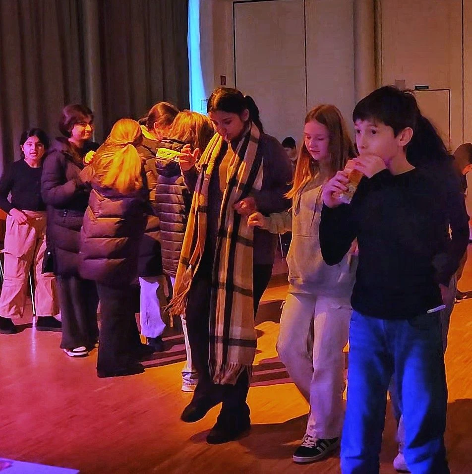 Über 40 Schülerinnen und Schüler des 5. Jahrgangs feierten gemeinsam in der Aula die Weihnachtszeit. Dabei wurde zu Weihnachtsmusik getanzt, Stopp-Tanz und Montagsmaler gespielt und eine Weihnachtssendung geschaut. Außerdem gab es ein großes "Weihnachtsschlickerei-Buffet" - Weihnachten geht durch den Magen. Organisiert wurde die Feier von Teilen des Schüler:innenparlaments und Frau Dierks. Für tolle Lichtstimmung und Musik sorgte das Technik-Team mit Frau Schiering. Die Moderation übernahmen Schüler:innen des 8. Jahrgangs.